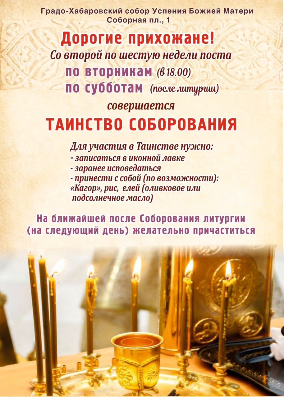 Дорогие братья и сестры, начиная со второй недели Великого поста в Градо-Хабаровском соборе Успения Божией Матери будет совершаться Таинство Соборования по вторникам после вечерней службы и по субботам после панихиды.