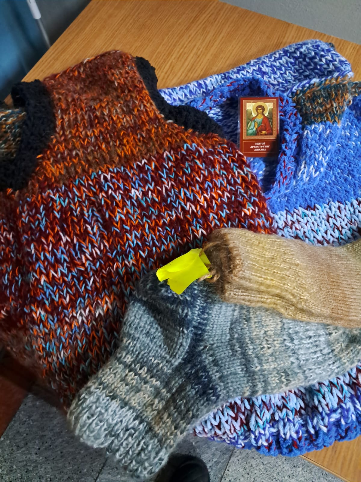 Наши мастерицы связали теплые носки и жилетки для мужчин, в жилетки также были вшиты иконки. Вязаные изделия хранятся в иконной лавке собора и раздаются воинам, которые приходят в храм.