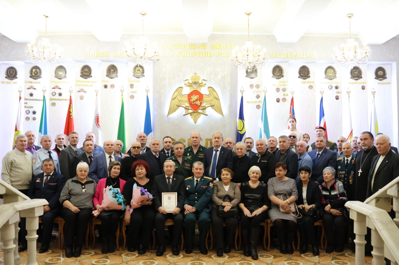 В «Зале Героев» Управления Восточного округа Росгвардии временно исполняющий обязанности командующего округом генерал-майор Андрей Рукавичников поздравил собравшихся ветеранов и вручил отличившимся грамоты, благодарности и ценные подарки.