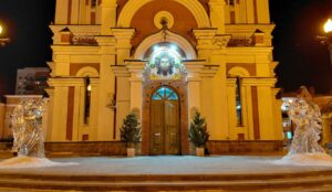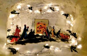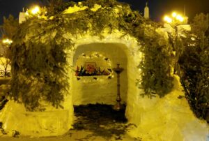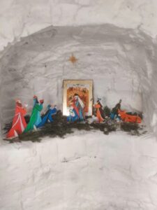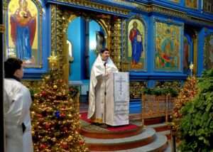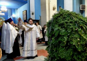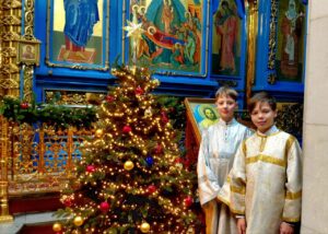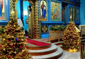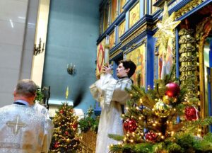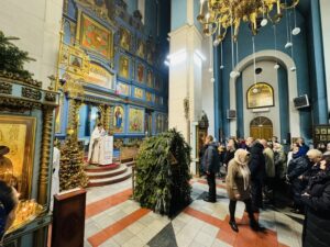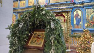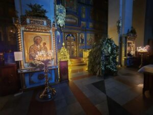Успенский собор был украшен к празднику еловыми ветками, наряженные елочки радовали глаз верующих и всех, кто посетил храм в праздничные дни. Хвойный вертеп над главной иконой торжественен и придает особую тишину — так замирает сердце перед яслями с Богомладенцем. Празднично украшенный храм — это наша выраженная радость о Рождестве!