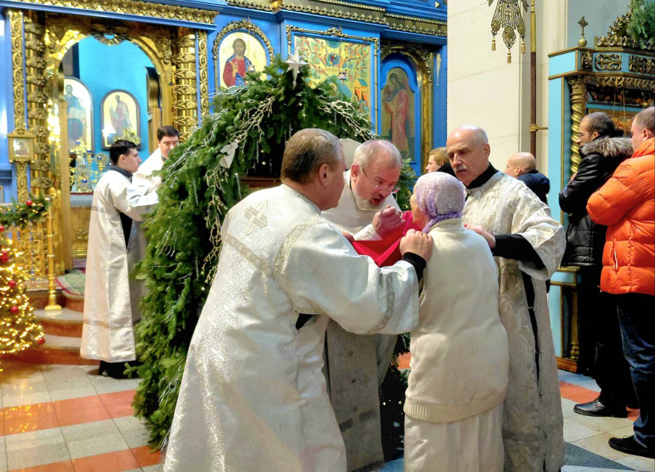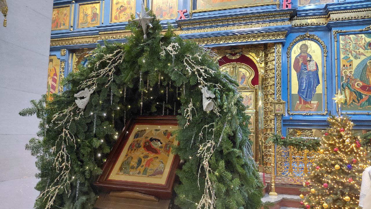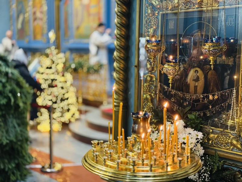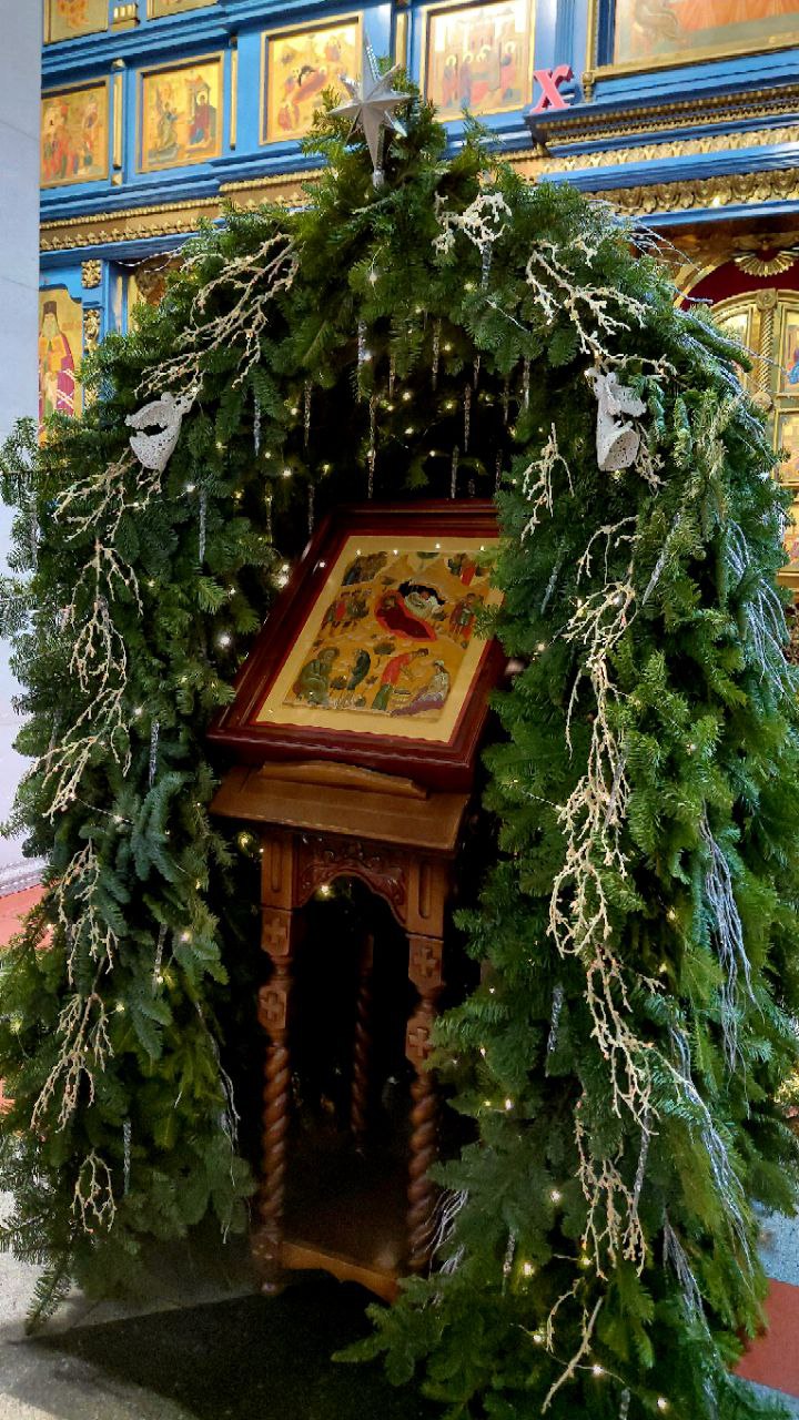 Успенский собор был украшен к празднику еловыми ветками, наряженные елочки радовали глаз верующих и всех, кто посетил храм в праздничные дни. Хвойный вертеп над главной иконой торжественен и придает особую тишину — так замирает сердце перед яслями с Богомладенцем. Празднично украшенный храм — это наша выраженная радость о Рождестве!